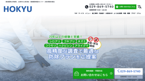 シロアリ駆除では高度なバリア工法を用い、ネズミ対応では再侵入を永続的に防ぐための物理処置を遂行するなど、種別ごとに専門的な手法を使い分けている。ゴキブリ駆除は33平米あたり6,600円(税込)から、ネズミ駆除は1回あたり20,000円〜と、費用目安をサイト上でオープンに公開。問い合わせ前に費用感を把握できる点を評価する声が目立つ。